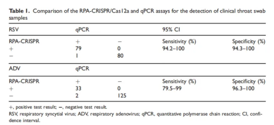 從急性呼吸道感染的兒童中采集咽拭子樣本160例。同時(shí)使用MIRA-CRISPR方法、qPCR方法進(jìn)行檢測(cè),并將結(jié)果與臨床試驗(yàn)結(jié)果進(jìn)行比較。與qPCR方法相比,MIRA-CRISPR方法對(duì)RSV和ADV的敏感性分別為98.1%和91.4%,檢測(cè)特異性均為100%。Kappa值大于0.95,表明其一致性程度較高。