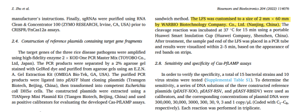 文章中側(cè)向流動(dòng)試紙條(LFS) 購自南京沃博生物科技有限公司 貨號(hào) JY0301 CRISPR Cas12/13 HybriDetect試紙條。公司常備現(xiàn)貨,歡迎垂詢!