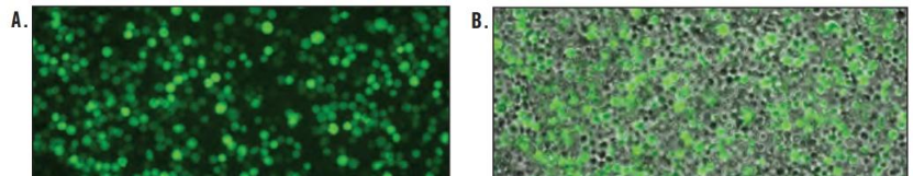 圖1. 使用TransIT®-Insect高效轉(zhuǎn)染桿狀病毒基因組DNA。6孔板里進行轉(zhuǎn)染,每孔5 x 105 Sf9細胞,質(zhì)粒和轉(zhuǎn)染試劑比例1:3,使用0.5ug表達GFP的ProGreen™桿狀病毒表達載體(AB Vector)和0.1 µg的pVL1393 轉(zhuǎn)移載體(AB Vector). (A)轉(zhuǎn)染后6天使用Zeiss S100熒光顯微鏡拍攝熒光和相位對比圖像。(B) Merge。