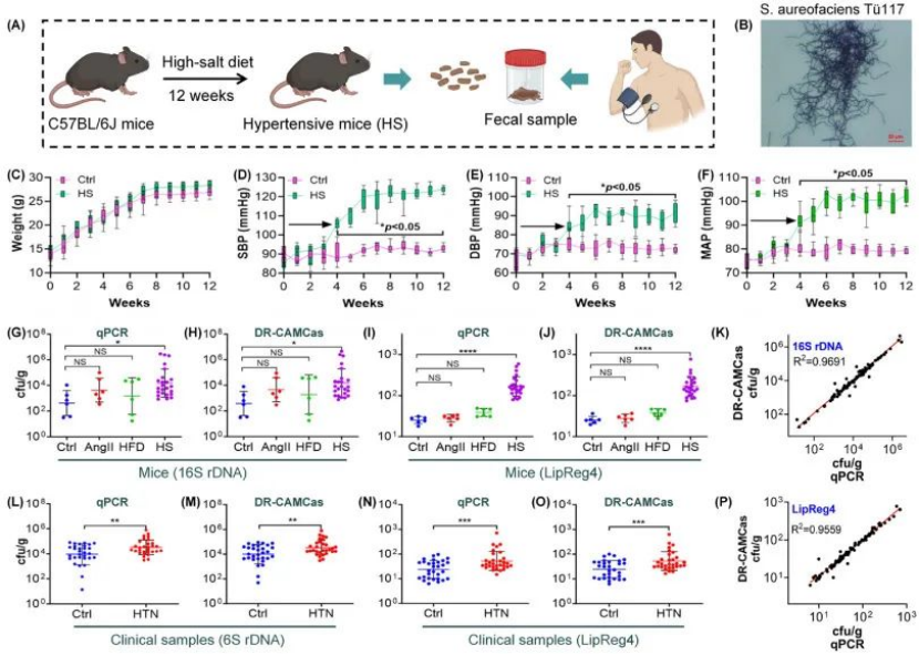 (A)高血壓患者和高鹽飲食誘導(dǎo)的高血壓模型小鼠的糞便樣本。(B)金色鏈霉菌 Tü117 的革蘭氏染色。比例尺:20μm。高鹽飲食小鼠對體重(C)、收縮壓(D)、舒張壓(E)和平均動(dòng)脈壓(F)的影響(n = 12)。(G - J)使用 DR-CAMCas 和 qPCR 檢測高血壓小鼠糞便樣本中的 16S rDNA 和 LipReg4 基因(對照組:6 只;血管緊張素 II 組:6 只;高脂飲食組:6 只;高鹽組:24 只)。(L - O)使用 DR-CAMCas 和 qPCR 檢測臨床樣本(正常人:30 人;高血壓患者:30 人)糞便樣本中的 16S rDNA 和 LipReg4 基因。(K,P)評估 DR-CAMCas 和 qPCR 在臨床樣本檢測中的一致性。*p < 0.05 與對照組相比,**p < 0.01 與對照組相比,****p < 0.0001 與對照組相比。