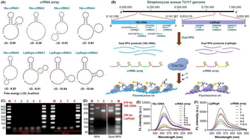 (A)crRNA 陣列的結(jié)構(gòu)、自由能和瓊脂糖凝膠。(B)crRNA 陣列的識(shí)別位點(diǎn)、雙重 RPA 過程以及 crRNA 陣列介導(dǎo)的 CRISPR/Cas12a 檢測信號的疊加效應(yīng)。(C)crRNA 陣列的瓊脂糖凝膠。(D)雙重 RPA 和單獨(dú) RPA 產(chǎn)物的瓊脂糖凝膠。(E、F)使用不同 crRNA 檢測 16S rDNA 和 LipReg4 基因的熒光光譜(金色鏈霉菌 Tü117:107 cfu/mL)。