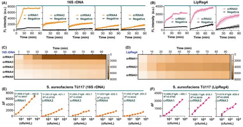 單鏈向?qū)?RNA(single crRNA)介導(dǎo)的 CRISPR/Cas12a 與雙重重組酶聚合酶擴(kuò)增(dual RPA)耦合對 16S rDNA 和 LipReg4 基因的熒光響應(yīng)(A、B)以及隨時(shí)間變化在不同單鏈向?qū)?RNA 存在下的熱圖。(E、F)使用單鏈向?qū)?RNA 介導(dǎo)的 CRISPR/Cas12a 與雙重 RPA 耦合檢測 16S rDNA 和 LipReg4 基因的檢測性能。