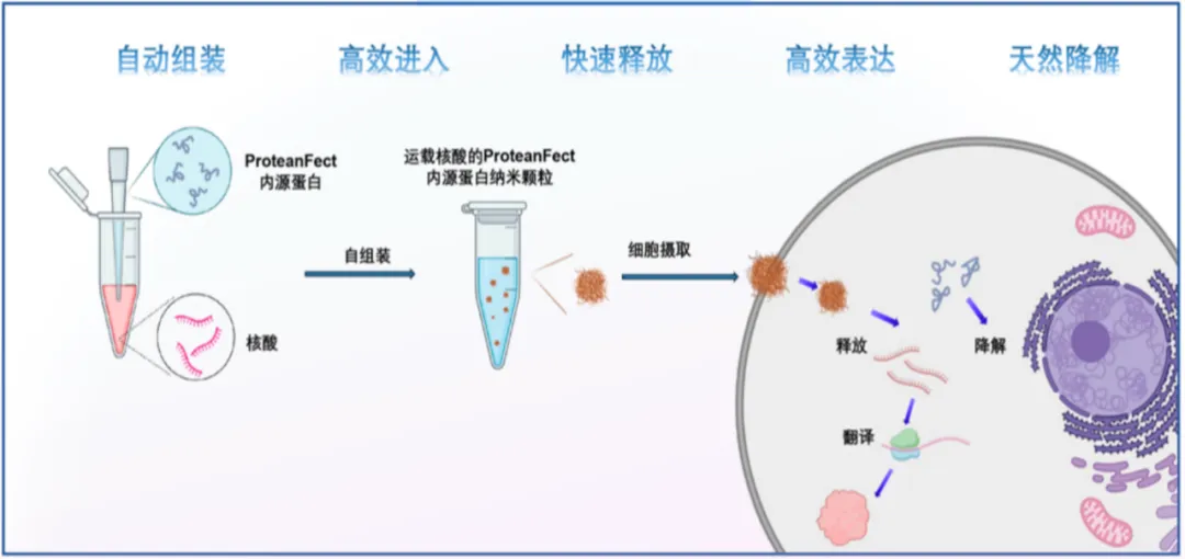 基于凝聚體原理,西湖凝聚體聯(lián)合西湖大學開發(fā)了 ProteanFect 蛋白分子,能夠在體外與核酸自組裝成高度規(guī)律的球體結(jié)構(gòu),形成蛋白納米顆粒。這種自組裝而成的ProteanFect-核酸復合物能夠: