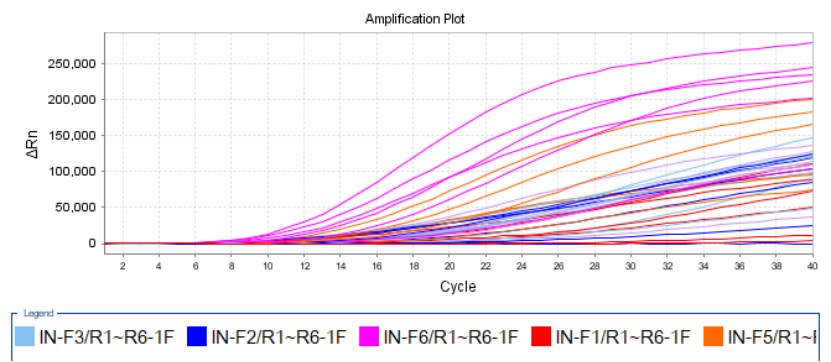 一條探針搭配不同引物的擴(kuò)增效率對比(上下游引物各6條,36種組合):